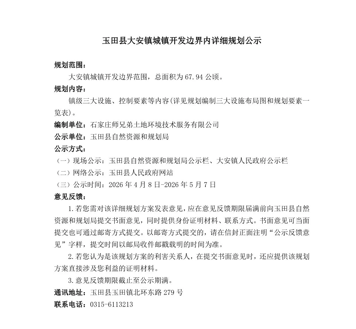 玉田县大安镇城镇开发边界内详细规划公示