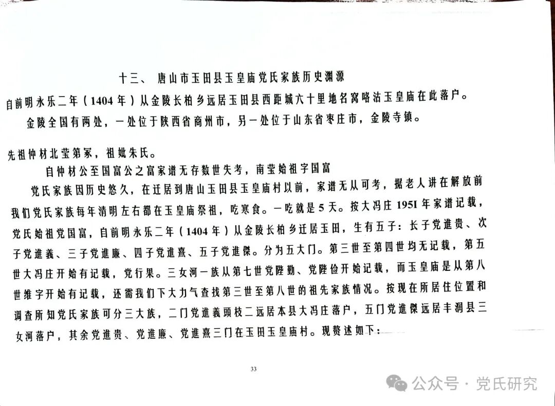 河北省唐山市玉田县玉皇庙党氏家族渊源
